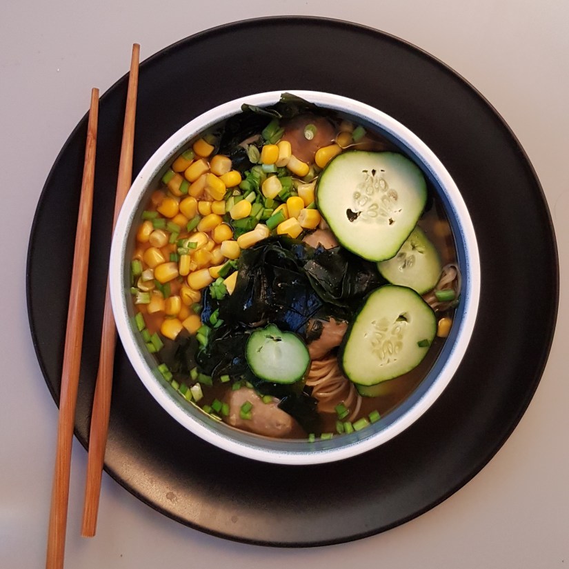 Le concept : on ajoute des nouilles et un peu de protéines tant qu’on y est.On prépare le même bouillon avec un peu moins d’eau – ou on s’attend à devoir sortir un bol plus grand. On ne met dedans que les algues, pas le reste de la garniture.En parallèle, on fait chauffer une grande casserole dans laquelle on fait cuire des nouilles – les Something ont une préférence pour les sōmen de blé Trois Bonheurs, mais vous êtes libres. On procède selon les indications du paquet à ceci prêt qu’on les goûte avant de les sortir pour vérifier qu’elles soient cuites selon nos préférences.
