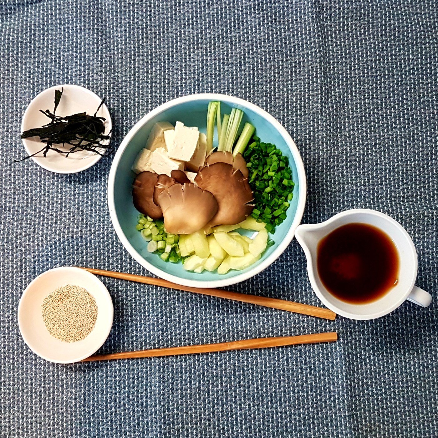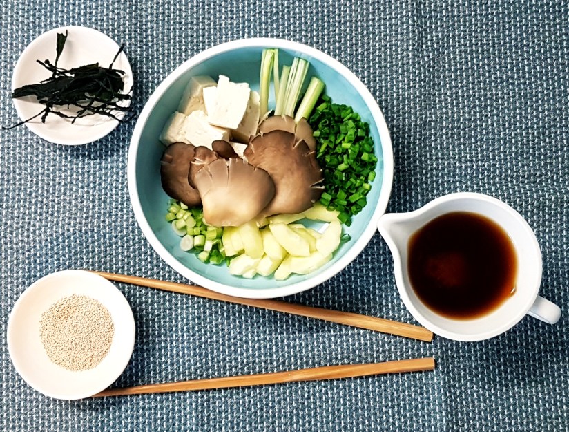 Quelques brins d’algues wakame séchées, genre trois cuillers à soupe de maïs, un oignon nouveau avec sa tige – on coupe le vert en tronçons et le blanc dans la longueur, en quatre ou plus selon sa taille -, environ 100 g de tofu, des champignons type shiitake frais ou des champignons de Paris – autant prendre moins authentique mais plus frais. Un trait d’huile de sésame, quelques graines pour se la raconter.